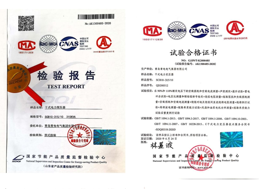 非晶合金干式電力變壓器檢驗檢測報告